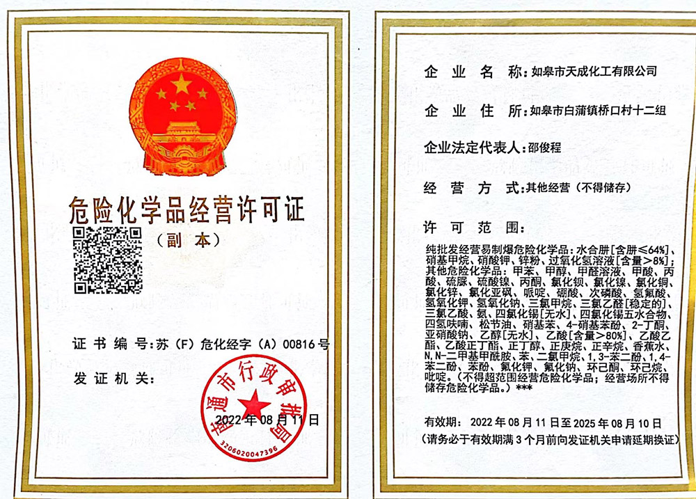 ? 如皋市天成化工有限公司創(chuàng)建于1996年。公司地處于美麗富饒的長江三角洲,座落在古鎮(zhèn)林梓,通揚運河河畔。南瀕長江、西臨204國道,距南通港、飛機場30公里,立體交通發(fā)達。公司經(jīng)營管理規(guī)范,技術力量雄厚,擁有一批高、中級專業(yè)技術人才。